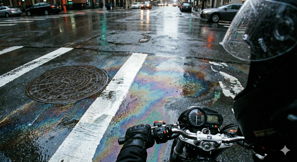 - Rögar Kapakları ve Çelik Plakalar: Metal yüzeyler, yağmurda buz pateni pisti kadar kaygandır. Mümkün olduğunca bu yüzeylerin üzerinden geçmekten kaçının. Eğer geçmek zorundaysanız, motosikletin düz ve dik olduğundan ve gaz, fren ve direksiyon kullanmadığınızdan emin olun.